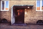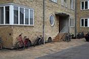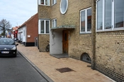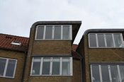 Hoveddøre til opgange er formet venligt beskyttende med vægflange og kobberinddækket udhæng, ligesom der er kælet for dørbladets skråtstillede plankebeklædning.