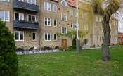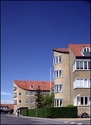De to parallelle boligstokke afsluttes mod syd af afrundede former, den fjerneste med mere maritimt udseende end den nærmeste.