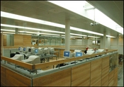 En række fællesfunktioner er placeret som fritstående opholdsøer/kuber i det store rum.