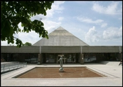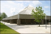 Bygningsanlægget domineres af to elementer - en kvadratisk etplans fladebygning med servicefunktioner og en kvadratisk pyramideformet halbygning. Tagkonstruktionerne er af lamineret træ og opbygget som modulstore kassetter.
