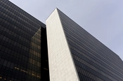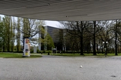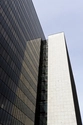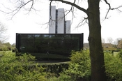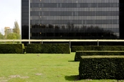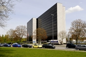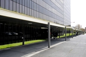 Det nordøstlige hjørne af forvaltningshøjhuset med styringscentralen i baggrunden. De petroleumsblå udluftningsrør kendes også fra Rødovre Bibliotek.