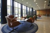 Siddegruppe med Svanen stole. I baggrunden trappenedgang til mødesal og kantine.