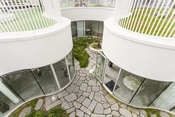 Kontorets primære funktioner placeres rundt om et åbent gårdrum for at udnytte dagslyset mest muligt. Atriummet er formet som en amøbe, hvis bløde former maksimerer lysindtaget i bygningen og sikrer, at lokalerne lever op til arbejdsmiljøkrav for lysindtag og udsyn. I gårdhaven skifter den varierede beplantning farver og teksturer efter årstiderne og det stenlagte område danner ramme om medarbejdernes pauser samt udendørs arbejdspladser.