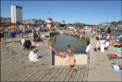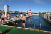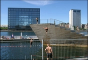 Friluftsbadet støder op til fællesarealerne ved Islands Brygge. Her det lave børnebassin set fra syd.