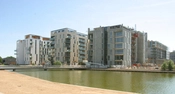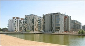 Det lave havnebassin er, som et moderne gadekær, trukket helt op imellem punkthusene.