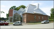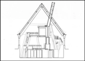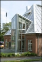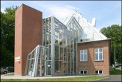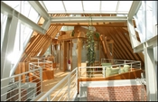 Et stort glastag ophængt i en stålkonstruktion som dækker hele det oprindelige hus. De kraftige bjælker er kun en markering af tagfladen.
