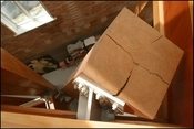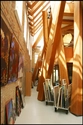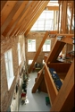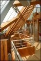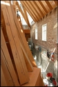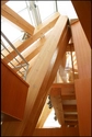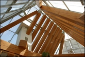 Et krav fra arkitekten var at bjælkekonstruktionen skulle have synlige stålbeslag, som har meget store bolte for at holde sammen på konstruktionen. Træstolperne, der måler 45 x 45 cm. er lavet af douglas fyr fra Canada