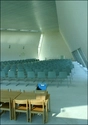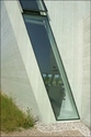 Indefra er kompositmaterialet gennemskinneligt og har en smuk stoflighed, hvor himmellyset brydes og spejles i facadens skrå flader og skaber genskin, bevægelse og farvespil i hvide, grå og grønlige nuancer.