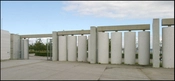 Anlægget er organiseret omkring en åben ’værkstedsgade’, der giver adgang til alle funktioner. Det er bygget op som to vinkelstillede fløje, der mødes i en rotunde. Rotunden er udformet som en cirkulær, søjlebåren bygning af pladsstøbt beton. Bygningerne er delvist beklædt med hvide fliser, der også ses som mosaikbeklædning, indstøbt i overfladen på indgangssidens 16 betonsøjler. Anlægget begrænses mod omverdenen af en bastionsmur, der er sammensat af nogle få betonelementer. Elementerne er støbt i lys, glat beton.