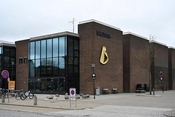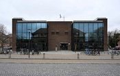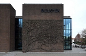 Biblioteksfunktionerne er samlet i ét stort rum, stueetage og balkonetage. Midt i hallen ligger et cafeteria. Bygningen, der er opført i brunt murværk, har fremspringende glaskarnapper i gavlene. Langsiderne er en række murede karnapper med vinduer imellem med bronzefarvet glas.