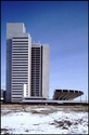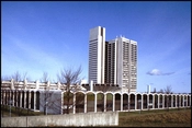 Hospitalet består af en 25 etagers sengebygning, der rejser sig over en lavere bygning med behandlingsafdelinger og laboratorier. Den flade behandlingsbygning er sammensat af kvadrater, som måler 15 x 15 meter. Herimellem løber tre meter brede gange.