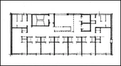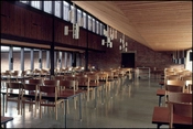 Fra forhallen udgår gange der forbinder administration, opholdsstuer, undervisningsrum og spisesal.