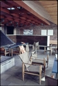 Betonen er ubehandlet i en temmelig grov udførelse. Under loftet de forunderligste tremmekasser i klare farver