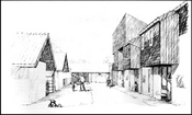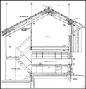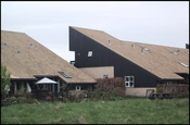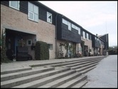 Den ensidigt hældende tagkonstruktion er beklædt med sorte brædder. Tagkonstruktionen danner store sammenhængende flader af gule vingesten ud mod fællesarealerne.Trapper optager forskelle i det kuperede terræn.