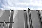 Facadeelementerne er udført som bærende sandwichelementer i fuld facadehøjde. Gavlelementerne er krumme betonelementer anbragt skiftevis konveks og konkav og overlappende hinanden. Lodrette vinduesbånd mellem elementerne giver gavlvæggene en indirekte belysning.
