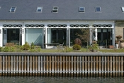 Facaden mod kanalen består af tofløjede, grønne træporte, hvorover der er karakteristisk, gennemgående vinduesbånd med krydssprossede ruder.