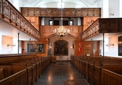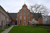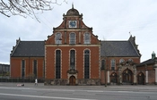Bygningens sydvestlige fløj fra 1563 står endnu inklusive den oprindelige gavl i renæssancestil med tydelige horisontale og vertikale inddelinger og en svungen kam. Dens langmure har hver fire høje, fladbuede vinduer med indfatninger i sandsten. Da kirken i 1641-1643 blev udvidet til den nuværende korskirke af Leonhard Blasius, genbrugte man skemaet, hvor også disse dele fik lignende vinduer og gavle. Her fik kirken sin nuværende geometri med hoved- og sideskibe.