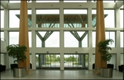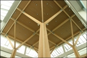 Foyeren domineres af de lodrette limtræsøjler, der bærer taget 13-14 meter over gulvet.
