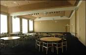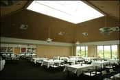 Det pyramideformede loft i restauranten er beklædt med trælister.