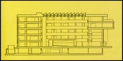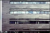 Mod vest og øst er facaderne dækket af kløvet skifer afbrudt af smalle horisontale vinduesbånd.