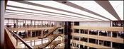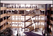 Trappeparti i atriets sydside betjener sammen med en tilsvarende trappe i rummets nordside kontorhusets 5 etager.