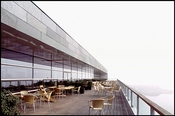 Den udkragede fjerde etage danner dæk for en sol- og panoramaterrasse foran kantinens sydfacade.