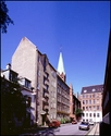 Stiftelsens gavl og den særprægede facade med reliefforskydninger, der danner en slags fortandingsmønster ud for ejendommens trappeopgang.