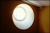 Karakteristisk cirkulært kældervindue med hvid lysning udført som en asymmetrisk keglestubfigur.