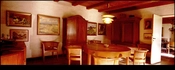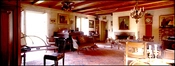 Den store stue har berappede vægge, træloft med synlige bjælker - og en fin overensstemmelse mellem rummets dimensioner og møblering.