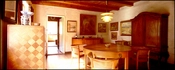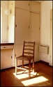 For datiden var køkkenskabe med skydedøre noget ganske nyt. Køkkenstolen er en variant af Kaare Klints kirkestol. Gulvene er brunbejdsede for at undgå skinnende blankhed som ved lakering.
