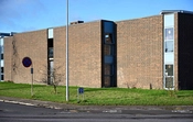 Facaderne mod Kettegård Allé er massive kun brudte af smalle vinduesbånd med blåmalede karme.