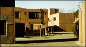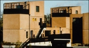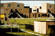 De brune facadeelementer med svagt hældende tagformer forlener bebyggelsens karakter med noget ørkenagtigt.