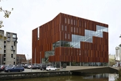 Udvendigt opføres bygningen i indfarvede betonelementer, beklædt med alu-lameller. Alux har leveret og monteret den udvendige solafskærmning på facaderne i tre forskellige farvenuancer. Solafskærmningen består af i alt 10.000 meter lamel, hvilket svarer til 30 tons aluminium. Lamellerne er 2-delte box-lameller på 40 x 250 mm med endebunde. De er monteret på betonelementer med afstandsrør.