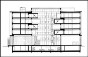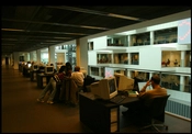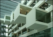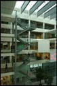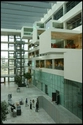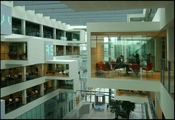 De fem etager er åbne ud mod atriummet, og fra balkonerne kan man overskue aktiviteter andre steder i huset. Studerende, der hilser og vinker på tværs af den store bygning, er derfor ikke noget særsyn. En række lokaler til møder og gruppearbejde er forlænget ud i atriummet, hvor de hænger som en lang række transparente ‘skuffer’, der er trukket ud i forskellig længde.