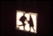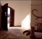 Motivet med kunstneren der modtager sin mæcen i hoveddørens glughul aftegner sig tydeligt som skyggebillede i ankomstrummet.