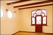 Det umøblerede spiserum i villaens lavere vestende. Til højre herfor er i forbindelse med den seneste restaurering af bygningen indrettet et moderne køkken.