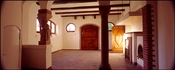 Interiør fra ankomstrummet med den brede tofløjede hoveddør og trappen der fører ned til landkøkkenet.