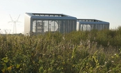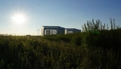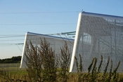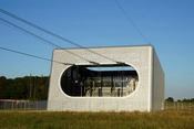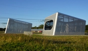 De to bygningsvolumener i perforeret aluminium, virker som om de vokser ud af landbrugslandskabet. Volumenernes karakter skifter mellem at være monolitisk og transparent, alt efter synsvinkel, hvilket giver en interessant dimension til deres relativt simple kubatur.