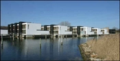 Der er adgang til boligerne ad træbelagte bådebroer. Den bærende del af gavlfacaderne er opført som en opspændt betonelementkonstruktion for at klare udkragningen til det elegante smalle hjærnevindue, der trækker den lave morgensol ind.