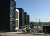 Kanalerne har forbindelse til den tidligere erhvervshavns inderste bassin, der fortsætter ud i et større havnebassin med lyst- og husbåde. De små altaner nærmest svæver over kanalernes vandspejl.