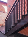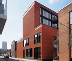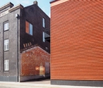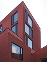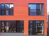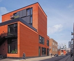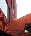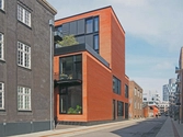 Huset er en fortolkning af de gamle værkstedsbygninger i insitu-støbt beton og rød tegl som har ligget i området. Facaden er muret i røde tegl med røde fuger, et skiftende løberforbandt fremhæver de horisontale linjer og danner et stærkt grafisk udtryk. Døre, vinduer, lysninger, rækværk og den udendørs trappe er i sort aluminium, mens soklen fremstår i mørk beton, som binder den sammen med den omgivende asfalt i de urbane gårdrum. De indre vægge står i rå beton.