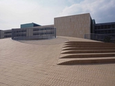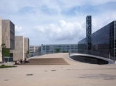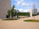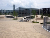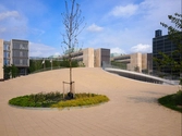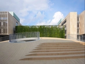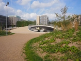 Samtidig med at pladsens kuperede landskab tilfører området en menneskelig dimension, fungerer det også som et vindfang. Bakkerne og beplantningen, skygger for den blæst, der tit bevæger sig fra fælleden og langs de store universitetsbygninger.