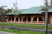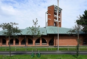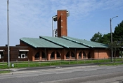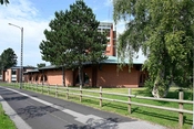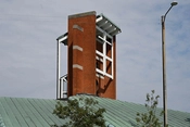 Umiddelbart vest for kirkesalen, i midten af bygningskomplekset, står kirkens karakteristiske klokketårn, hvor klokkerne hænger frit fremme.