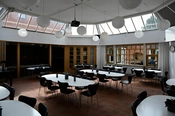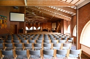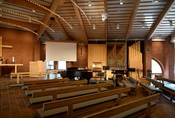 Kirkesalen er utraditionelt vinkelformet. Mod øst står alteret i vinklens yderhjørne, lige overfor indgangen i vest, og mod syd strækker lokalet sig mod vest med ekstra siddepladser. Mod nord er lokalet noget kortere og bidrager til alterområdets mere intime stemning med bænkene, der er opsat i en halvcirkel om alteret.