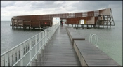 En 100 meter lang træbro fører fra den nyanlagte strand nord for Kastrup Lystbådehavn ud til til runde badeanlæg.