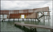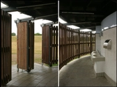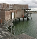 På landsiden indeholder en rund bygning toiletter og omklædningsrum.