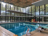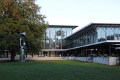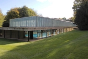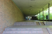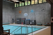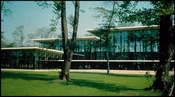 Facadens slanke, opadstræbende stålsøjler og loftets lette gitterkonstruktion er samtidig et ekko af de træer, der omgiver hallen. På den måde er skellet mellem ude og inde opløst. Inde i hallen er man i forbindelse med haven udenfor og det udendørs soppebassin, hvis mosaikbund er udført af maleren Henning Damgaard Sørensen.