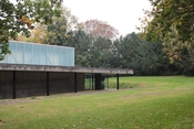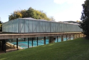 Bygningens tre lette tage, der dækker over hver sit bassin, svæver ind over hinanden. Hvert bassin er i loftet markeret af en let rumgitterkonstruktion, mens alle ydervægge mod haven er af glas.