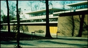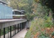 På to sider lukker bygningens underetage sig mod omgivelserne for at afskærme omklædningsfaciliteter mv.