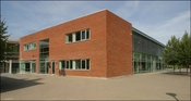 Bygningen består af to dele, - den ene af tegl og den anden af glas. Teglmuren er valgt så den tilpasses den bagvedliggende skole.